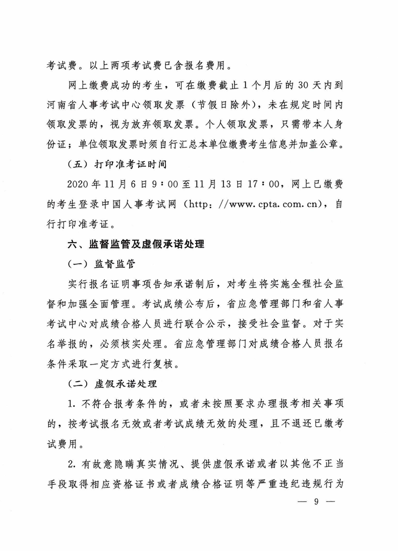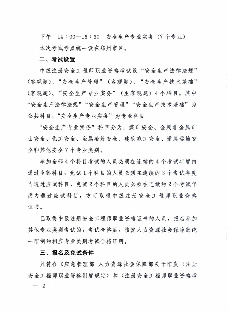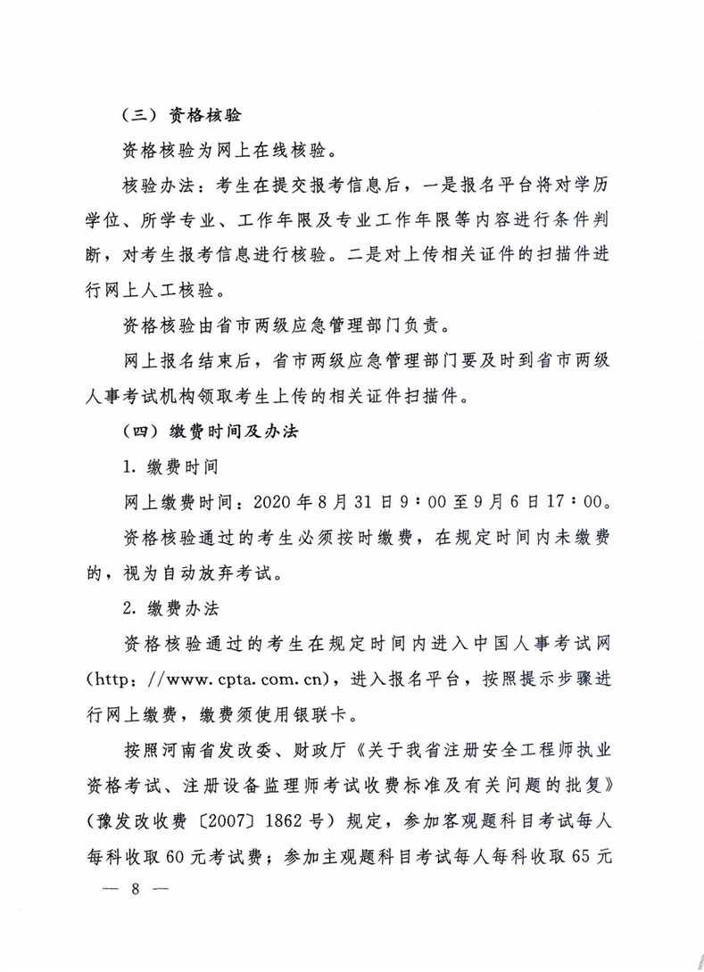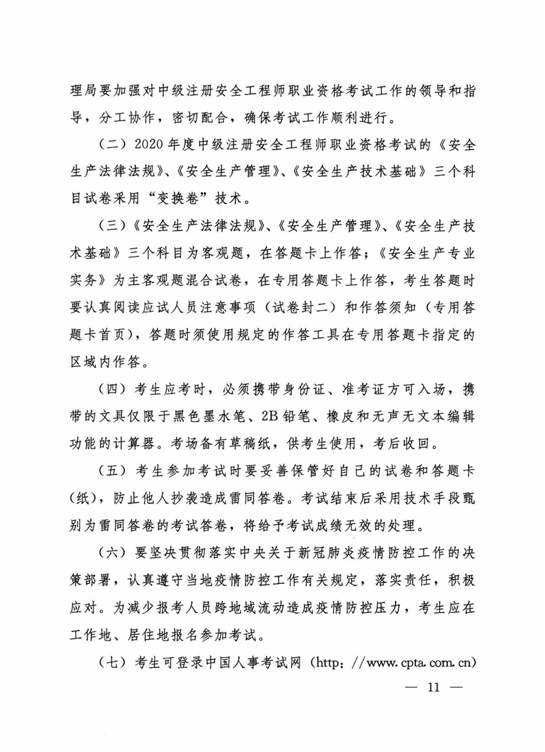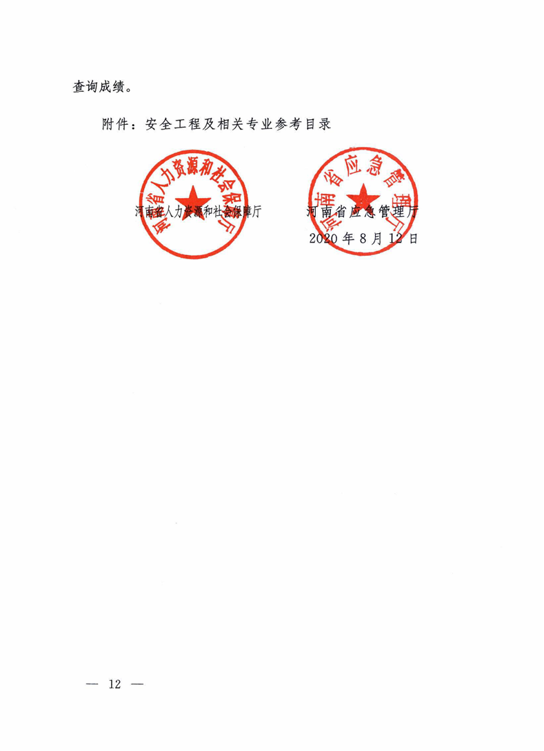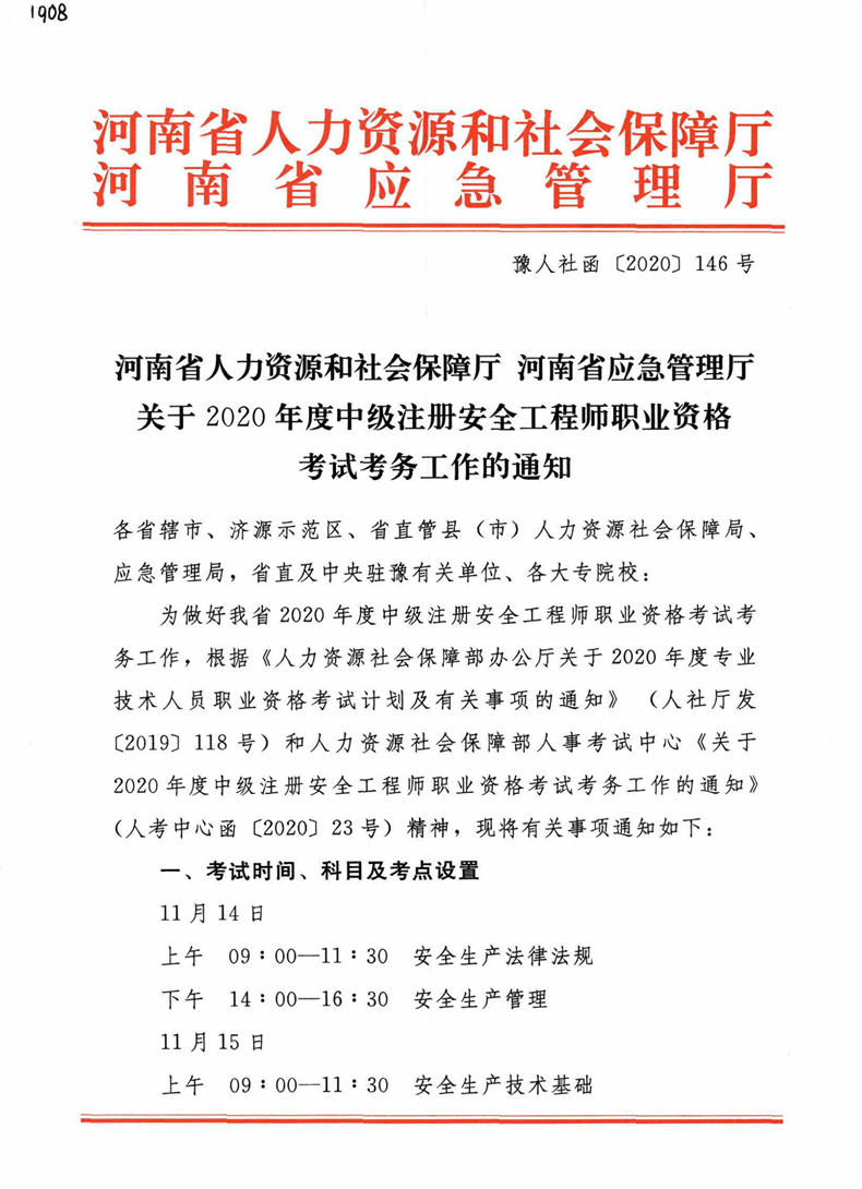 河南省人力资源和社会保障厅 河南省应急管理厅 关于2020年度中级注册安全工程师职业资格 考试考务工作的通知
