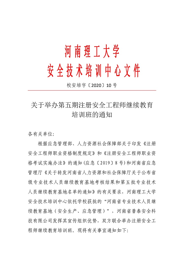 关于举办第五期注册安全工程师继续教育 培训班的通知