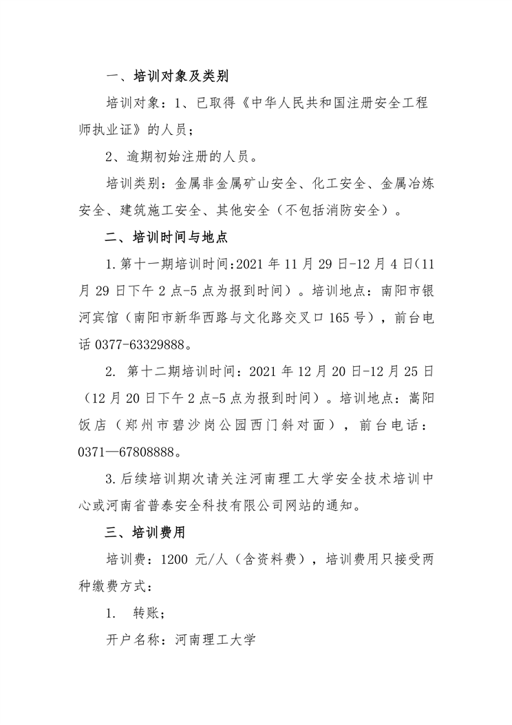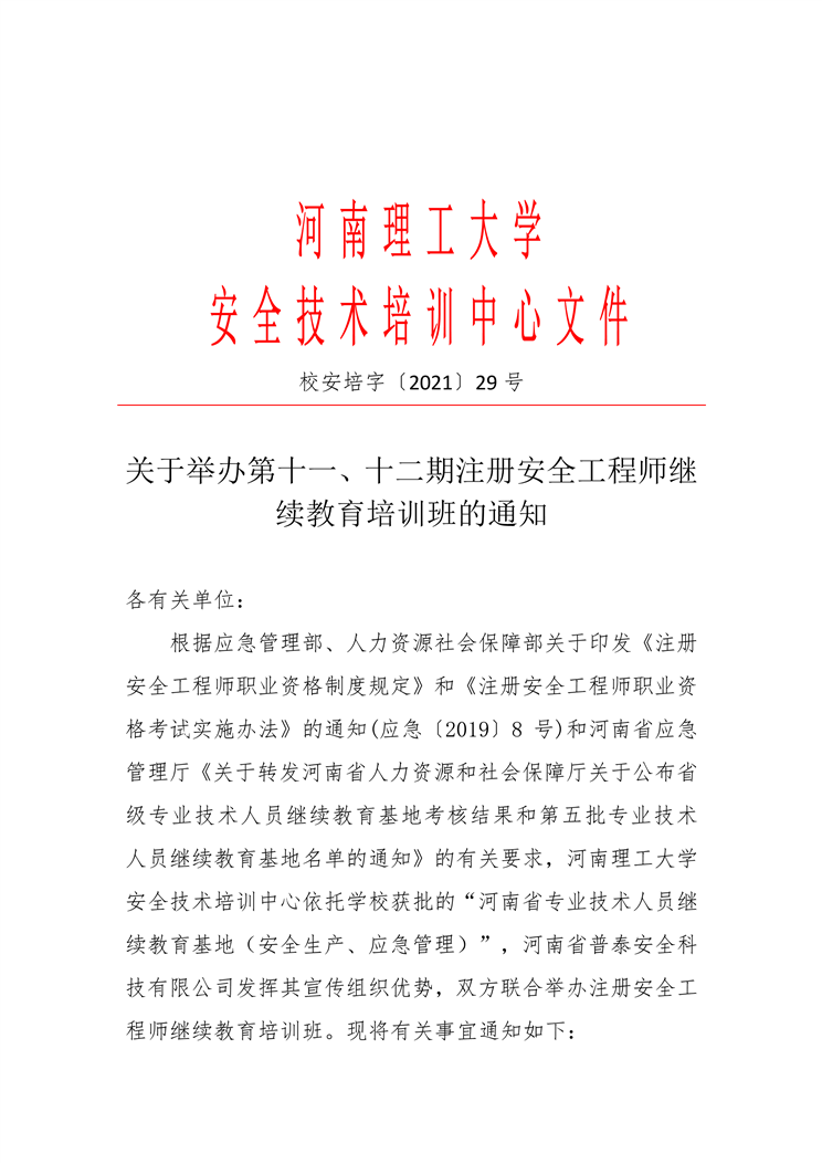 关于举办第十一、十二期注册安全工程师继续教育培训班的通知