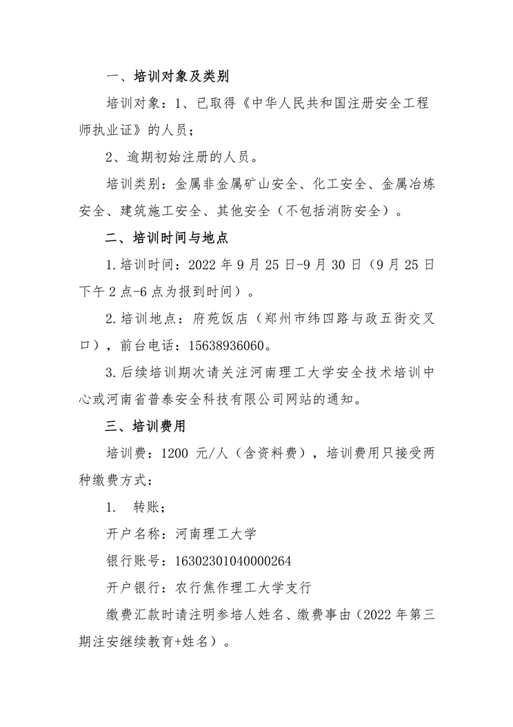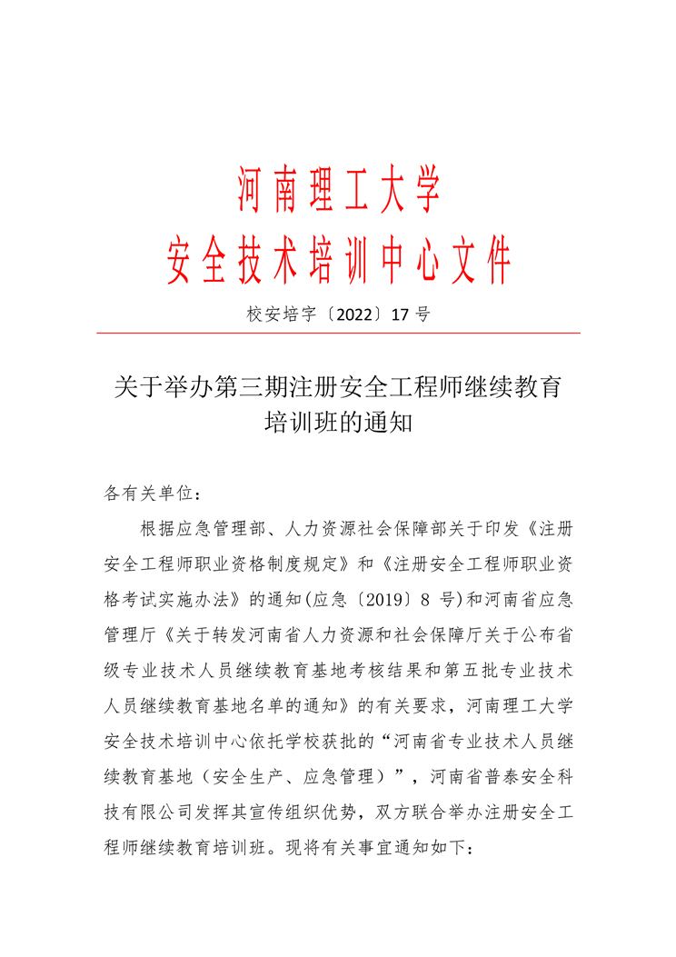 关于举办第三期注册安全工程师继续教育培训班的通知